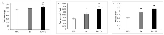 As shown in Figure 1A, BW increased in the EV group (p < 0.05) and in the EV + HFD group (p < 0.01) compared with CTRL. However, there was a significant increase in BW in the EV + HFD group compared with EV (p < 0.05). Ovarian weight (Figure 1B) and ovarian index (Figure 1C) were significantly higher (p < 0.01) in the EV as well as in EV + HFD groups, when compared with CTRL, while there were no differences between the EV and EV + HFD groups.