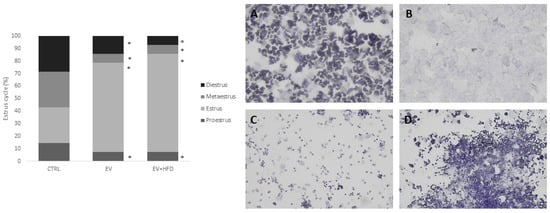Figure 2. Left: the proportion of different estrous cycle stages in the three groups was analyzed using the Chi-square test, and differences were evaluated by z-test. * p < 0.05 vs. CTRL. Right: photographs showing different phases of estrus cycle in rats ((A)—proestrus; (B)—estrus; (C)—metaestrus; (D)—diestrus).