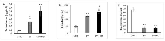 Serum level of testosterone was significantly higher in the EV group (p < 0.05) and in the EV + HFD group (p < 0.01) when compared with CTRL (Figure 3A). Serum level of estradiol was significantly higher in the EV group and in the EV + HFD group (p < 0.01) when compared with CTRL. Moreover, the EV + HFD group expressed higher level of estradiol compared with the EV group (p < 0.05), as shown in Figure 3B. Progesterone level significantly decreased in both EV and EV + HFD groups (p < 0.01), as shown in Figure 3C.