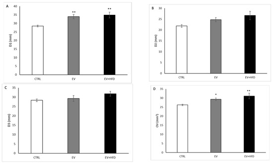As demonstrated in Figure 4, D1 was significantly higher in both PCOS groups, EV and EV + HFD (p < 0.01), compared with the non PCOS–CTRL group. On the other hand, D2 and D3 diameters of ovary were not altered in EV and in EV + HFD when compared with the CTRL group. However, OV was significantly higher in the EV group (p < 0,05) and also in the EV + HFD group (p < 0.01) compared with control values. Nevertheless, a difference between EV and EV + HFD was not registered in the mentioned ultrasound parameters.