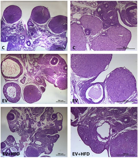 Figure 5. Photomicrographs of ovarian central sections. C—control group; EV—PCOS group, treated by estradiol-valerate; EV + HFD—PCOS group treated by estradiol-valerate and high fat diet. Left column—magnification 2.5×; Right column—magnification 5×.