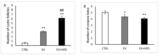 The number of cystic follicles increased significantly after both type of protocols (p < 0.01) compared with the CTRL group. However, the EV + HFD group expressed greater number of cysts compared with the EV group (p < 0.01), as shown in Figure 6A. Regarding the number of corpora lutea, EV administered alone led to significant reduction of these formations (p < 0.05), as well as EV along with HFD protocol (p < 0.01). However, there was no observed difference between the EV and EV + HFD group in the number of corpora lutea (Figure 6B).