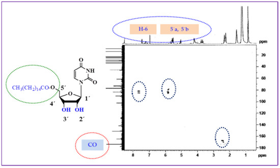 The reduced field and finely allocated protonic signal from the Ar-NH displayed the first point in the COSY data of derivative 2. Thus, Ar-NH’s peak at the diagonal’s middle left had a cross-peak marked Ar-NH, H-5′a, and H-5′b that linked to H-5′s signal. Thus, the Ar-NH proton at approximately δ 9.00 was coupled to the proton whose signal appeared at approximately δ (6.01 to 5.46) (i.e., H-5′a and H-5′b protons). Similarly, the peak of H-2′ was coupled to the signal from 2H, CH3(CH2)13CH2CO- by a cross-peak to explore the interaction between H-2′ and 2H, CH3(CH2)13CH2CO-. The lower field shift of H-1′, H-4′, H-3′, H-5′a, and H-5′b compared to initial derivative 2 ensured palmitoyl group insertions at C-5′ (Table 1). The structure of 5′-oxo-(palmitoyl)uridine was confirmed by examining its COSY, HSQC, and HMBC spectral experiments (Figure 2) and 13C-NMR spectrum (2).