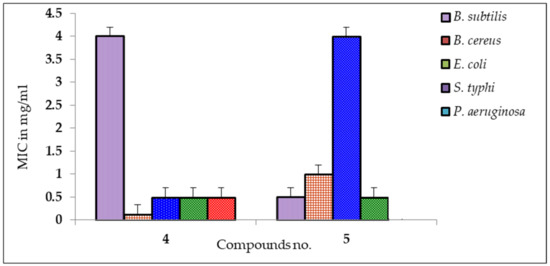 Based on the antibacterial results, compounds 4 and 5 showed considerable efficacy against all microorganisms. In support of this, compounds 4 and 5 were screened to further explore the MIC and MBC. The MIC values showed that compounds 4 and 5 had a maximum MIC value of 4.00 mg/L against E. coli and B. subtilis and a minimum value of 0.13 mg/L against B. cereus. The graphical representation of the MIC test (as presented in Table S2) appears in Figure 3.