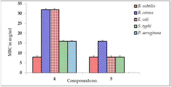After determining the MIC for compounds 4 and 5 against the bacterial pathogen, the MBC was also determined. For this compound, the MBC was found to be 16 mg/L against B. cereus, S. typhi, and P. aeruginosa. Compound 4 was more effective against E. coli and B. cereus, and its MBC value of 8 mg/L was among the smallest. The graph of MBC values for the bacterial organism is shown in Figure 4.