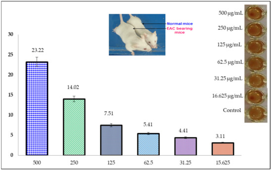 Only compound 6 showed anticancer efficacy after screening compounds 1 to 7. Finally, the ability of the synthesized compounds to produce cytotoxic effects was investigated by MTT assay. Compound 6 (2′,3′-di-oxo-cinnamoyl-5′-oxo-palmitoyluridine), the most promising compound, was used in vitro on EAC (Ehrlich ascites carcinoma) cells in a dose-dependent manner (Figure 5). At the highest concentration of 500 µg/mL, compound 6 showed only 23.22% cytotoxicity effects, whereas at 250, 125, 62.25, 31.25, and 15.625 µg/mL, it was 14.02%, 7.51%, 5.41%, 4.41%, and 3.11%, respectively. The inhibitory effect of the compound decreased with decreasing concentration, and the IC50 was determined to be 1108.22 g/mL. According to the results, there was no significant reduction in cancer cells.