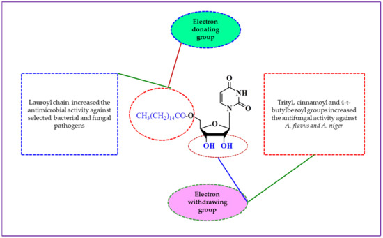 Structurally, a nucleoside derivative is a nucleobase joined with a sugar ring with modifications different from those of natural nucleosides. Nucleobase modifications include acylation, halogenation, and the addition of azido groups, and sugar modifications include ring opening, halogenation, acylation, and hydroxylation or dehydroxylation [14,15,16]. In the sugar component, the modifications are mainly ribofuranose or deoxyribofuranose of nucleosides, including variation in the sugar component, alteration of the oxygen with another atom, insertion of heteroatoms in the sugar molecule, ring size alterations, and replacement with acyclic components [17]. Due to their chemical and physical properties, these variations result in significant alterations in biological behavior and toxicity dimensions [18]. Uridine, along with nucleobases, has been identified by researchers as being a pharmacologically varied category that includes cytotoxic compounds, antibacterial and antifungal drugs, and immune-suppressing molecules [19,20]. This discovery was made possible by the fact that nucleobases also contain uridine. Furthermore, studies on the regioselective acylation of nucleoside or carbohydrate derivatives and their subsequent antimicrobial screening [21,22] have demonstrated that the incorporation of two or more highly electron-dense heteroaromatic nuclei and aliphatic chains can significantly amplify the antimicrobial properties of the original nucleus [23].