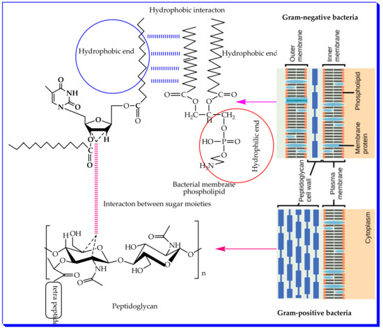 It is postulated that the acyl chains of uridine, which are contained within the lipid-like structure of bacterial membranes, may engage in hydrophobic interactions that are analogous in nature. Bacteria lose membrane permeability as a result of hydrophobic contact, which ultimately results in the death of the bacteria. The study aimed to establish the structure–activity relationship (SAR) of the uridine derivatives that were synthesized based on the results obtained. In addition, it was discovered that adding the palmitoyl group at the C-5′ position and the palmitoyl group at the C-3′ position in compound 2 both improved the antibacterial activity of uridine (1) (Figure 7). Additionally, the produced nucleoside analogs showed encouraging binding affinity against both membrane and DNA proteins in the computational analysis. For the convenience of cellular metabolism, nucleoside derivatives mimic natural nucleosides and insert themselves into DNA and RNA. Most antimicrobial nucleoside derivatives function by preventing the chain of nucleic acids from lengthening during the synthesis of DNA (for DNA viruses) or RNA (for RNA viruses).