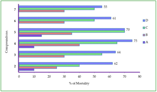 Figure 8 represents the cytotoxicity of uridine derivatives (2–7) that were synthesized, as measured by the brine shrimp lethality bioassay method [31]. The figure displays the percentage of shrimp mortality after 24 and 48 h. Long alkyl chains and phenyl rings increased hydrophobicity and cytotoxicity [32]. Based on the data, it was determined that uridine derivative 2 (5′-oxo-palmitoyluridine) had the lowest degree of toxicity, with a 31.21% death. Derivatives 3 (2′,3′-di-oxo-lauroyl-5′-oxo-palmitoyluridine) and 4 (2′,3′-di-oxo-myristoyl-5′-oxo-palmitoyluridine) demonstrated the highest levels of toxicity (i.e., 48.24–49.28% death), showing increased mortality.