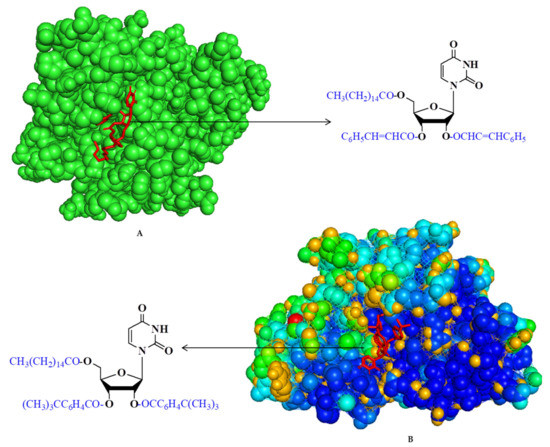 To investigate the mode of binding of the synthesized uridine derivatives, three derivatives (4, 6, and 7) with the maximum binding affinities were chosen based on docking evaluation results. As shown in Table 6, the aromatic ring-based esters showed higher docking energy values than the long chains with derivatives. Collisions between the ligand and active residues of 1RXF and 3000 are described in Figure 9, which was obtained by analyzing the docking complex in Discovery Studio Visualizer. The amino acid residues played a crucial function in the total energy of interaction [37]. Based on docking results, Figure 10 expresses the complex arrangement of the two most active compounds, 6 and 7.