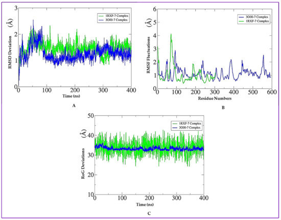 MD simulation for 400 ns of each system was performed to examine intermolecular conformational binding and interactions along the length of the simulation time. The simulation trajectories were first investigated for root mean square deviation (RMSD) in angstrom [38]. The average RMSD values of the 1RXF-7 and 3OOo-7 complexes were 1.7 Å and 1.5 Å, respectively. Initially, the complexes were unstable in the first 100 ns, followed by stable dynamics toward the end of the simulation time (Figure 11A). Protein residue flexibility was evaluated via root mean square fluctuation (RMSF) [39]. Protein residues were relatively stable with few minor fluctuations (Figure 11B). In particular, the active pocket residues exhibited considerable stability with RMSF values < 2 Å. The RMSD stability of proteins was additionally validated by radius of gyration (RoG) [40], which depicted the highly compact nature of the proteins (Figure 11C). The average RoG value of 1RXF-7 was 36 Å, while that of 3OOo-7 was 35 Å.