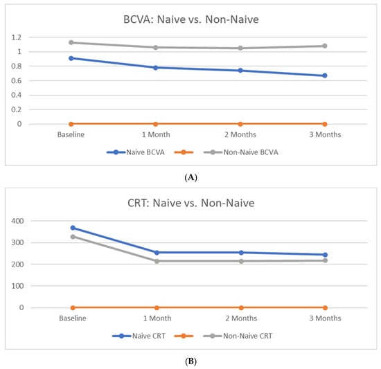 Considering the BCVA improvement stratified to fluid accumulation site, instead, the treatment-naive IR group demonstrated better outcomes versus the non-naïve group, while eyes with baseline SRPE displayed significant positive changes only for treatment-naïve individuals. As for the two SR groups, instead, they both showed comparable inter-group results. The possible reasons to which ascribe better trends found in the treatment-naïve compared to the non-treatment naïve group are probably to be attributed to the fact that the second subgroup of patients, despite receiving an intensive protocol with previous anti-VEGF drugs, showed no or little response to those agents, which led to drug switching. The therapeutic refractory course of the disease led, in turn, to a compromission of the local cellular homeostasis that reflected worse functional gain compared to the efficiently treated naïve patients.