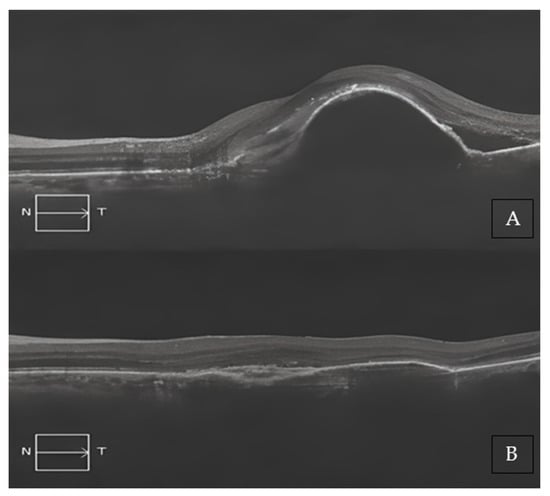 Continuous variables were reported as mean ± standard deviation (SD), and categorical features were reported as count (frequency). The normal distribution of continuous variables was verified with the Kolmogorov–Smirnov test. Analysis of variance (ANOVA) and post hoc analysis with the Games–Howell test were performed according to the results of the Levene test homogeneity of variance to assess changes for both CRT and BCVA throughout the follow-up. Paired t-test was used to assess the mean differences between mean BCVA in each cohort on the basis of fluid site presence (IRF, SR, and SRPE) at 3 months versus baseline. Statistical analysis was performed using IBM SPSS software (IBM Corp. Armonk, New York, NY, USA, version 28.0). Results were considered statistically significant when the p-value was <0.05.