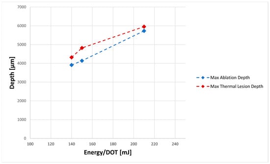 A plot of the depth as the energy increased: the curve with a red line is the Maximum Thermal Lesion Depth achieved with the SCAR3 scanner; the curve with a blue line is the Maximum Ablation Depth achieved with the SCAR3 scanner.