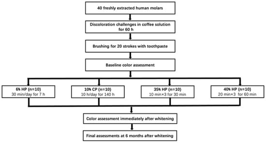 | CP10 | Opalescence TM PF 10% (Ultradent Products Inc, South Jordan, UT, USA) | An amount of 10% carbamide peroxide, glycerin, water, xylitol, carbomer, PEG-300, sodium hydroxide, EDTA, potassium nitrate, and sodium fluoride | Load the whitening gel into the deepest and outmost portion of custom tray, and wear the tray 8–10 h overnight | 10 h/d, 14 d (total 140 h) |