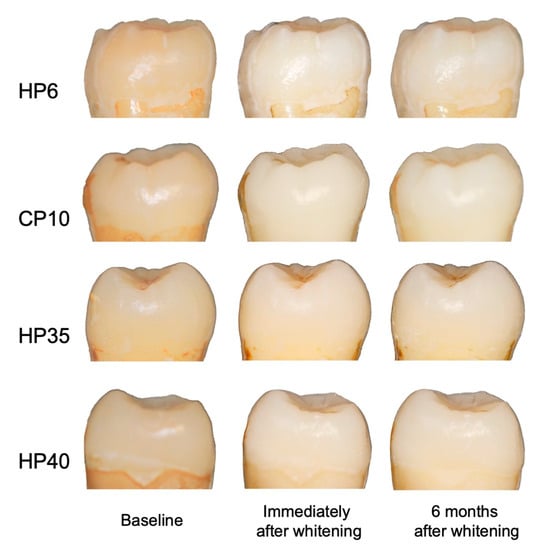 - Lilaj, B.; Dauti, R.; Agis, H.; Schmid-Schwap, M.; Franz, A.; Kanz, F.; Moritz, A.; Schedle, A.; Cvikl, B. Comparison of Bleaching Products with Up to 6% and With More Than 6% Hydrogen Peroxide: Whitening Efficacy Using BI and WI (D) and Side Effects—An in vitro Study. Front. Physiol. 2019, 10, 919. [Google Scholar] [CrossRef]