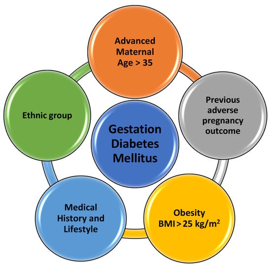 Risk factors associated with gestational diabetes mellitus. Advanced maternal age > 35, previous adverse pregnancy outcome, overweight and obesity (BMI > 25 and 30 kg/m2 subsequently), previous history of gestational diabetes or family history, and specific ethnic groups (Asian, Hispanic, African, Native American, Pacific islander, Indigenous Australian) are all risk factors associated with gestational diabetes mellitus. (BMI, body mass index) [12,13,14,15,16].