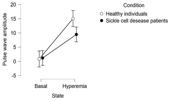 The results of the present study show that there was no significant difference between SCA patients and healthy subjects in pulse wave amplitudes in the basal state. It has previously been reported that increased peripheral blood flow occurs during the steady state with a periodic microcirculatory flow pattern, which may compensate for alterations in red blood cell rheology. The arteriolar diameter increases during the vaso-occlusive crisis compared to the intervals between the crises [7]. However, during the post-occlusion hyperemia test, SCA patients had small pulse wave amplitudes. This difference probably reflects the increased endothelial damage caused by repeated insults. The increase in pulse amplitude by hyperemia reflects a complex vascular response to ischemia [40,41]. Selvaraj et al. [42] reported that the PPG amplitude response reflected the metabolic component reinforcing the later course of RH. The results of the present study are consistent with the data of other groups examining endothelial dysfunction in SCA. Patients with sickle cell anemia had severely impaired endothelial function during crises [43] and in a steady-state phase [6] as compared to health-matched controls. Other studies reported that the group of patients who had more symptoms had a significantly lower RH index than the group that was not as symptomatic.