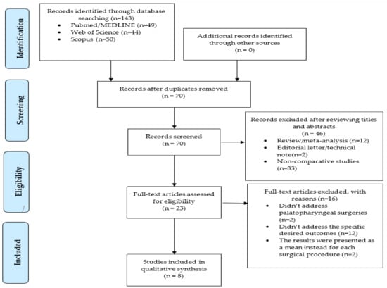 The authors identified a total of 143 potentially suitable studies through the search strategy presented in the Methodology section. The studies’ selection steps are summarized in Figure 1. After eliminating the duplicates through the Endnote reference manager, a total of 70 articles were analyzed regarding the title and abstract, applying the selection criteria to find the most appropriate studies for the review. All reviews, meta-analyses, editorial letters, and all studies that did not compare at least two surgical techniques were excluded, resulting in 23 full-text papers examined for eligibility. After removing the studies with incomplete or inappropriate information, eight studies were considered qualified for data extraction.