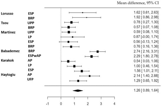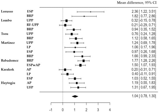 In the subgroup analysis, a random-effects model was applied to the UPP, BRP, and ESP techniques (Figure 3). These techniques were selected because they had sufficient studies available for analysis. However, it was not possible to perform a subgroup analysis for the other techniques due to limited data availability. Only one or two studies were available for those techniques, which did not provide enough data to conduct a meaningful comparison. Nevertheless, the results and trends of the other techniques were described and discussed based on the available studies.