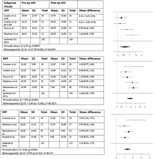 Statistical analysis was conducted using the Jamovi software 2.3.26. The analysis was carried out using the mean difference as outcome measure to compare pre- and postoperative apnea–hypopnea index (AHI) and Epworth Sleepiness Scale (ESS) outcomes. We adopted a random effects model to estimate effects measures by 95% confidence interval. Forest plots for each outcome were provided. A total of 7 studies were included in the AHI analysis, and 6 studies were included in the ESS analysis. The Q-test and the I2 statistic were calculated to assess the presence of data heterogeneity between studies. To compare the surgical techniques (UPP, ESP, and BRP), subgroup comparisons were performed. Binary variables were created to represent the utilization or non-utilization of each technique in the studies compared. For example, in the BRP vs. UPP comparison, a binary variable was assigned a value of 1 for sub-studies that performed the BRP technique and 0 for UPP studies. Similar binary variables were constructed for the other comparisons. These binary variables served as moderators in the analysis, enabling a direct comparison between the techniques while considering the specific technique employed in each study.