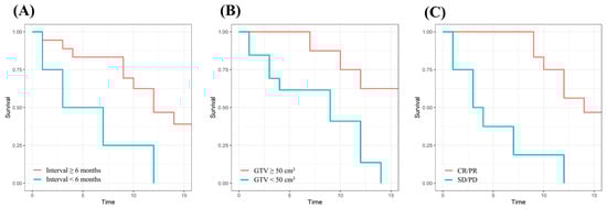 Kaplan–Meier curves showing local progression-free survival based on (A) interval between irradiations, (B) gross tumor volume size, and (C) response to re-irradiation.