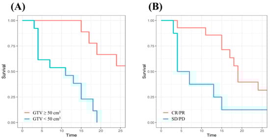 Regarding the prognostic factors for OS, ECOG performance status (p = 0.019), GTV (p = 0.002), and response to re-irradiation (p = 0.014) were significantly associated with OS in the univariate analysis. The GTV (HR: 8.71, 95% CI: 2.11–35.88; p = 0.003) and response to re-irradiation (HR: 0.35; 95% CI: 0.12–0.96; p = 0.042) were the independent prognostic factors influencing OS in the multivariate analysis. In terms of GTV, the median OS for patients who had small-sized GTVs was 31 months compared to 11 months for those with large-sized GTVs. The 1- and 2-year OS rates were 88.9% and 55.6%, respectively, for patients with GTV < 50 cm3 compared to 46.2% and 0% for patients with GTV ≥ 50 cm3. Patients who responded to re-irradiation exhibited a higher median OS (19 months) than patients who were resistant to re-irradiation (5.5 months). The 1- and 2-year OS rates for patients who responded to re-irradiation were 85.7% and 31.7%, respectively. In contrast, the 1- and 2-year OS rates for patients resistant to re-irradiation were 37.5% and 12.5%, respectively (Figure 3).