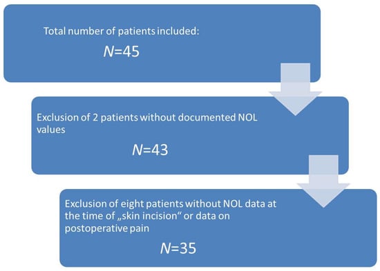 - Bollag, L.; Jelacic, S.; Upegui, C.D.; Wu, C.; Richebe, P. The nociception level index (NOL) response to intubation and incision in patients undergoing video-assisted thoracoscopic surgery (VATS) with and without thoracic epidural analgesia. A pilot study. F1000Research 2018, 7, 875. [Google Scholar] [CrossRef] [PubMed]