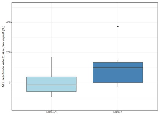 | NOL reaction to knife to skin (pre vs. Post [%]) | −12.3 (−54.6/53.6) | 119 (51.1/262.5) | 0.005 |