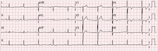 The patient underwent routine preoperative examinations 15 days before the surgery, including electrocardiography (ECG), trans-thoracic echocardiography (TTE), chest X-ray, and laboratory blood tests. The resting 12-lead ECG recorded normal sinus rhythms with left ventricular hypertrophic patterns (Figure 1). The preoperative TTE was unremarkable without any valvular abnormalities or restricted wall movement. The left ventricle ejection fraction (LVEF) was measured to be 57%. His chest X-ray showed fibrotic scars in the bilateral upper lobes, suggestive of inactive tuberculosis lesions. The laboratory results were within normal limits, except for a slightly elevated HbA1c level of 6.8%. The patient underwent consultations with a cardiologist, a pulmonologist, and an endocrinologist, and, due to the high risk of systemic diseases, was classified as the American Society of Anesthesiologists Physical Status Classification III. Prior to entering the operating room, the patient was premedicated with intramuscular injections of glycopyrrolate (0.2 mg) and famotidine (20 mg).