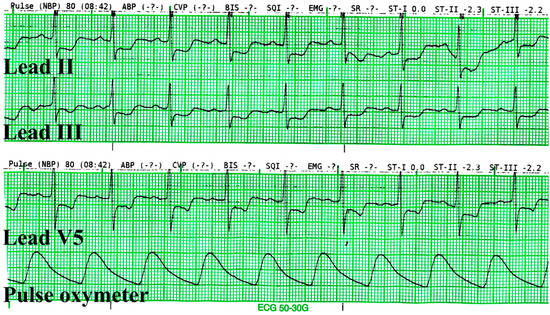 Upon entering the operating room, the patient was monitored with augmented limb ECG with continuous ST-segment analysis, non-invasive blood pressure (NIBP) (MX700, Philips Healthcare), pulse oximetry (Nellcor™ SpO2 Adhesive Sensors, Medtronic), and bispectral index (BIS™ Quatro, Medtronic). Initial vital signs prior to induction of general anesthesia were: NIBP 142/60 mmHg, heart rate 81 beats/min, and SpO2 95%. ST-segment depression and T-wave inversion were observed on ECG leads II and III. The ST-segment numeric value analysis at the J 60 point of leads II and III were −2.3 and −2.2, respectively (Figure 2). At this point, the induction phase of anesthesia was put on hold, and venous blood samples were drawn from the patient for cardiac biomarkers. An additional precordial V5 lead was placed, and a 12-lead ECG was performed for immediate evaluation. ST-segment depressions were also observed on leads V4, V5, and V6, while the remaining leads were ambiguous.