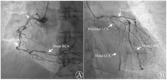 Emergency coronary angiography shows occlusion in multiple sites. (A) The right coronary artery (RCA) was found to be occluded by 90% at the proximal segment, 70% at the mid-portion, and 80% at the distal segment; (B) the left circumflex artery (LCX) was occluded by 95% at the proximal segment and 100% at the distal segment. The left anterior descending artery (LAD) was occluded 80% at both the proximal and distal portions.