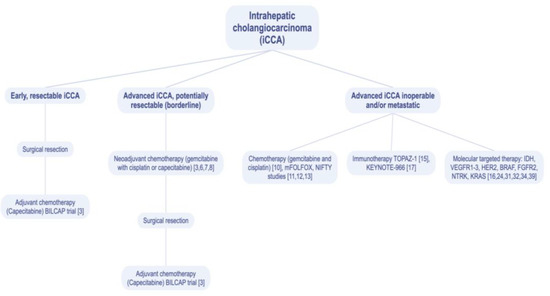 Intrahepatic cholangiocarcinoma (iCCA) accounts for 10–15% of primary hepatic malignancies [1]. Histologically, it belongs to the adenocarcinomas originating from the biliary tract. The incidence of this neoplasm is gradually increasing each year. Factors that may predispose to this neoplasm are inflammatory conditions within the biliary tract, especially primary sclerosing cholangitis [2]. The median age of onset for iCCA is 70 years and the average 5-year survival is only 8% [3]. Surgery is still the most important therapeutic modality, achieving a median overall survival (OS) in the range of 27–36 months with complete R0 (excision with margins of healthy tissue) resection [4,5]. Unfortunately, only 15% of patients diagnosed with iCCA will be able to receive surgical treatment, the remaining patients being diagnosed at an inoperable stage, requiring them to receive systemic treatment [5]. The dynamic development of cancer immunotherapy and the ever-improving molecular diagnostic capabilities of tumors provide opportunities to conduct multiple clinical trials in this area. Some of those trials have already been read out and provided the basis for changing the standards of treatment in advanced iCCA tumors. The overarching goal of all systemic treatment interventions in advanced disease is prolonging the survival of patients with iCCA while ensuring a good quality of life. Figure 1 shows the treatment recommendations for intrahepatic cholangiocarcinoma (iCCA) depending on the stage and molecular characteristics of the disease.