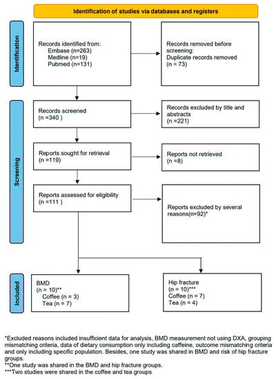 Studies were included in the meta-analysis if they were (1) observational studies (cohort or case-control), (2) focused on coffee or tea intake, (3) included outcomes that are of interest for our study (i.e., BMD measured through dual-energy X-ray absorptiometry [DXA] and hip fracture risk), (4) offered information on the frequency and amount of coffee or tea intake, and (5) reported accurate data pertaining to BMD or hazard ratios (HRs) for hip fractures (including 95% confidence intervals [CIs]). Studies not fulfilling the aforementioned inclusion criteria (e.g., studies on mixed beverages and those not differentiating between the effects coffee and tea intake) were excluded from our analysis. If multiple articles were discovered to have originated from a single study, only the article offering the highest volume of information was included.