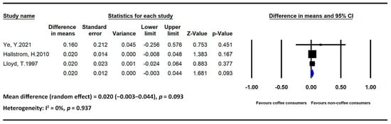 Two studies regarding the effects of coffee on BMD included only postmenopausal women, whereas one study included both men and women. We divided the total number of participants into high- and low-intake groups using 2 cups/day as the threshold. Regarding heterogeneity among the study populations, an analysis of the data obtained from studies including postmenopausal women revealed a nonsignificant association between coffee intake and BMD (MD = 0.020, 95% CI = −0.003 to 0.044, and p = 0.093; I2 = 0% and p = 0.937).