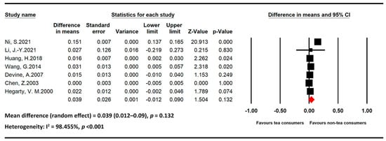 All seven studies regarding the effects of tea on BMD included only postmenopausal women [11,37,38,39,40,41,42]. The association of tea intake with BMD was nonsignificant in this population (MD = 0.039, 95% CI = 0.012–0.09, and p = 0.132). Heterogeneity among the studies was high (I2 = 98.455% and p < 0.001).