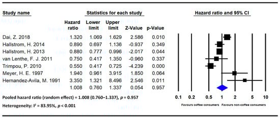Seven studies investigated the effects of coffee on hip fracture risk [14,17,20,21,23,25,26]. The pooled HR for individuals with high levels of coffee intake was 1.008 (95% CI = 0.760–1.337 and p = 0.957; I2 = 83.95% and p < 0.001). No strong association was noted between coffee intake and hip fracture risk.
