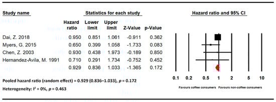 Four studies evaluated the effects of tea on hip fracture risk [11,24,25,26]. The pooled HR for individuals with high levels of tea intake was 0.929 (95% CI = 0.836–1.033 and p = 0.172; I2 = 0% and p = 0.463). No strong association was noted between tea intake and hip fracture risk.