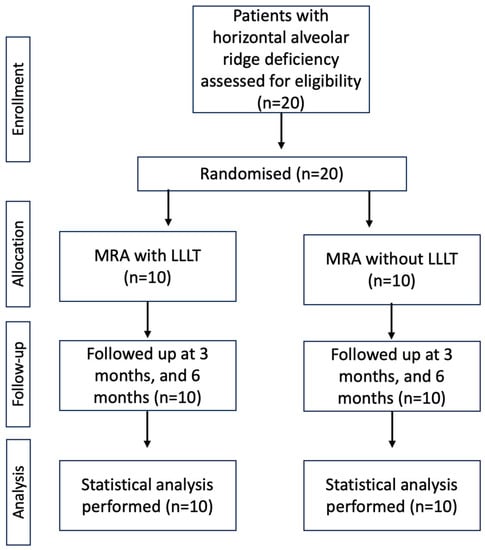 A total of 20 healthy adults aged between 21 and 60 years and exhibiting inadequate alveolar ridge dimensions in the maxillary and mandibular regions were randomized into test (n = 10) and control (n = 10) groups. The test group received minimalistic alveolar ridge augmentation with LLLT, and the control group received minimalistic ridge augmentation alone. The primary objective of the study was to measure the gain in ridge width (GRW) and assess the bone quality of the regenerated bone in Hounsfield units (HU). The secondary objective of the study was to explore the adjunctive role of LLLT in minimally invasive ridge augmentation. Other parameters measured were patient-related outcomes (PRO) such as pain, swelling, and discomfort during and after the procedure. A flow chart of the study design is presented in Figure 1.