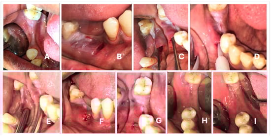 Surgical technique: (A) preoperative ridge width; (B) vertical incision on the attached gingiva mesial to the defect; (C) flap elevation with periosteal elevator; (D) diode laser tip inserted into the pouch for LLLT; (E) graft carrier inserted for bone graft deposition; (F) graft filled; (G) Vicryl sutures placed; (H) three months follow-up; (I) six months follow-up.