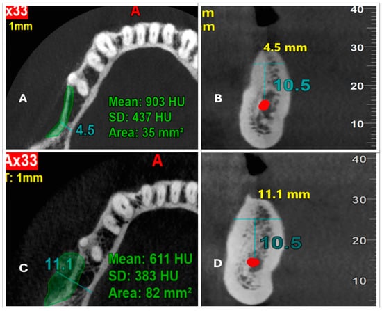 CBCT analysis of the ridge width and bone density. (A) Preoperative ridge width and bone density in the axial plane; (B) preoperative ridge width shown in the coronal plane 10.5 mm above the inferior alveolar nerve; (C) postoperative ridge width and bone density in the axial plane; (D) postoperative ridge width shown in the coronal plane 10.5 mm above the inferior alveolar nerve.
