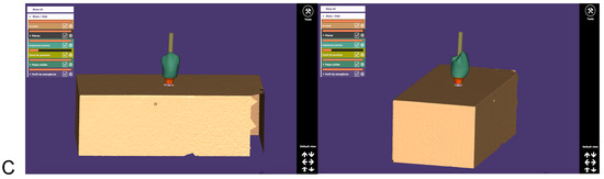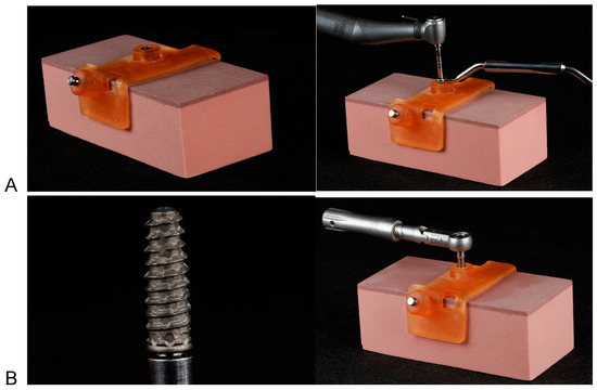The installed implant had dimensions of 3.5 × 11 mm and a morse taper prosthetic connection (Maestro, Implacil De Bortoli). The guided surgery kit from the same manufacturer was used for test base installation, following their milling recommendations. Furthermore, an implant motor and a 20:1 reduction counter-angle (NSK) were used at a speed of 900 rpm (Figure 1B). After installation in the block, the implant had an initial stability, measured by a torquemeter, of 45 N.