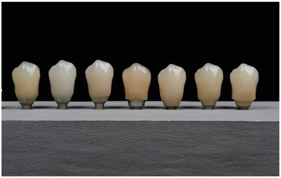 From this model, 7 similar crowns were made with 7 different material compositions, as shown in Figure 2. The crowns made using the CAD/CAM method were hybrid, that is, cemented on a titanium base, and the set was screwed onto the implant [21].
