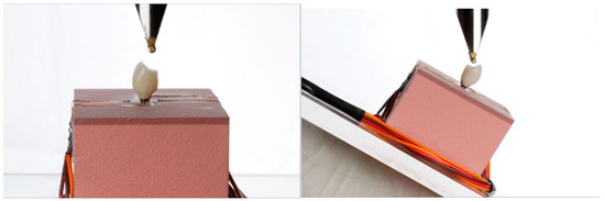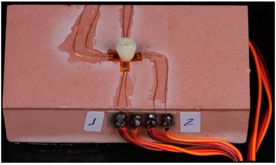 It is also important to emphasize that the position of the strain gauges was chosen to simulate the buccal, lingual, mesial and distal positions, and they were all connected to the strain gauge conditioning unit as shown in Figure 3.