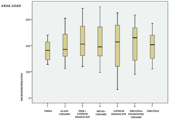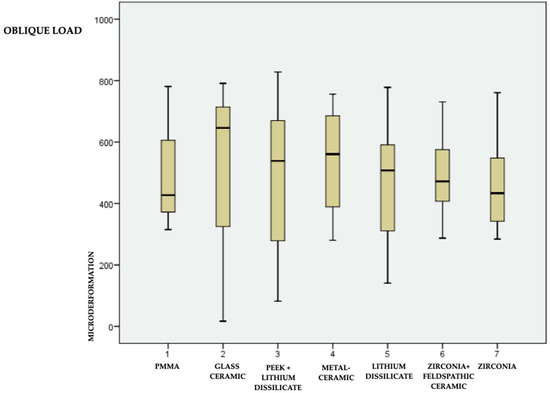 The data are in Table 2 and graphically represented in box plot form (Figure 5 and Figure 6 for the axial and oblique loads, respectively). The representation of materials in Figure 5 and Figure 6 follows the arrangement of materials in Table 1.