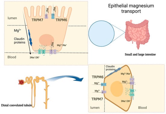 The transportation of Mg involves eight cation transporters, which have been identified as transient receptor potential melastatin cation channels 6 and 7 (TRPM6, TRPM7), solute carrier family members 1 and 2 (SLC41A1, SLC41A2) channels, ancient conserved domain protein 2 (ACDP2), the mitochondrial RNA splicing 2 protein (Mrs2p), Mg transporter 1 (MagT1), human solute carrier family 41, and paracellin-1 [5]. TRPM7, located in various organs, including the heart, blood vessels, intestines, liver, lungs, brain, and spleen, is the most selective transport channel. Its existence is necessary for cell function survival [6]. TRPM6, on the other hand, regulates the body’s Mg concentration through the kidneys and intestines [7]. TRPM6 is mainly found in the colon and in the distal convoluted tubule (DCT), where such distribution strengthens the main role of regulating the Mg homeostasis in the human body (Figure 1) [8]. The relationship between TRPM6 expression and magnesium status was demonstrated in two mouse models. The findings revealed that dietary magnesium restriction and hypomagnesemia increase TRPM6 expression to enhance Mg absorption [9]. Mg efflux is carried out by several anti-porters and co-transporters, with the Na+/Mg2+ exchanger being considered the most important, and it is found on the smooth muscles of the heart and the blood vessels. Various factors might affect these exchangers, including vasopressin, angiotensin II, and insulin [5,10].