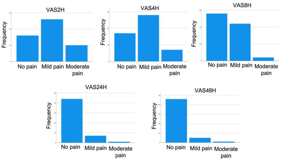 The Friedman test exhibited that pain perception is significantly associated (p < 0.05) with time (Table 5). Therefore, a pairwise comparison was conducted and found that pain perception was significantly different (p < 0.05) with each time difference, except for 24 H and 48 H (Table 6).