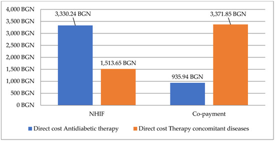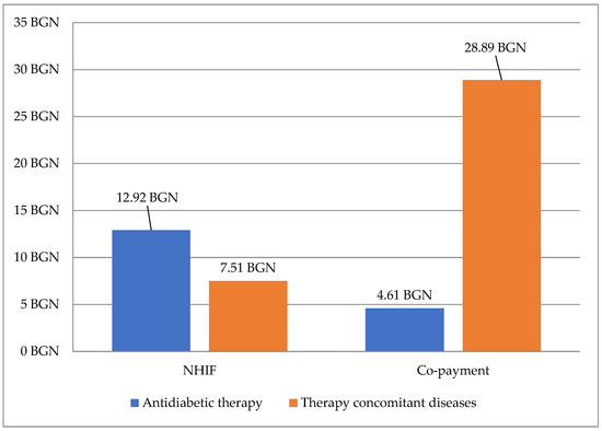 Total direct monthly costs paid by NHIF were higher for antidiabetic therapy (BGN 3330.24 in comparison with BGN 935.94 for therapy for concomitant diseases) [Figure 2]. The total out-of-pocket payment was lower for patients on antidiabetic therapy in comparison with copayment for concomitant therapy (BGN 1513.65 BGN vs. BGN 3371.85).