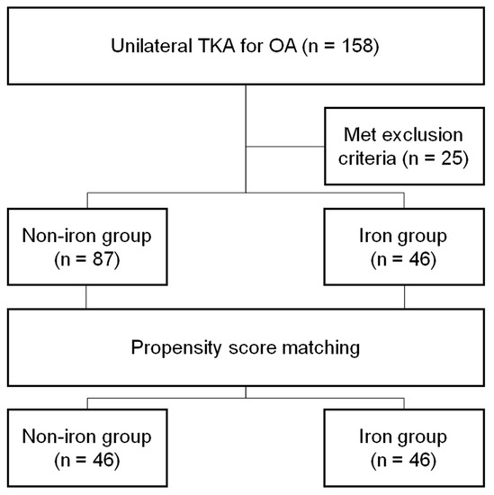 Flow diagram of the study. After propensity score matching, both groups comprised 46 patients. OA, osteoarthritis; TKA, total knee arthroplasty.