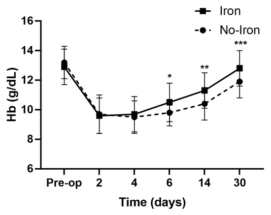 Serial changes in Hb. Hb values on postoperative days 6, 14, and 30 were significantly higher in the iron group than in the non-iron group. * p = 0.032, ** p = 0.021, *** p = 0.019. Hb, hemoglobin.